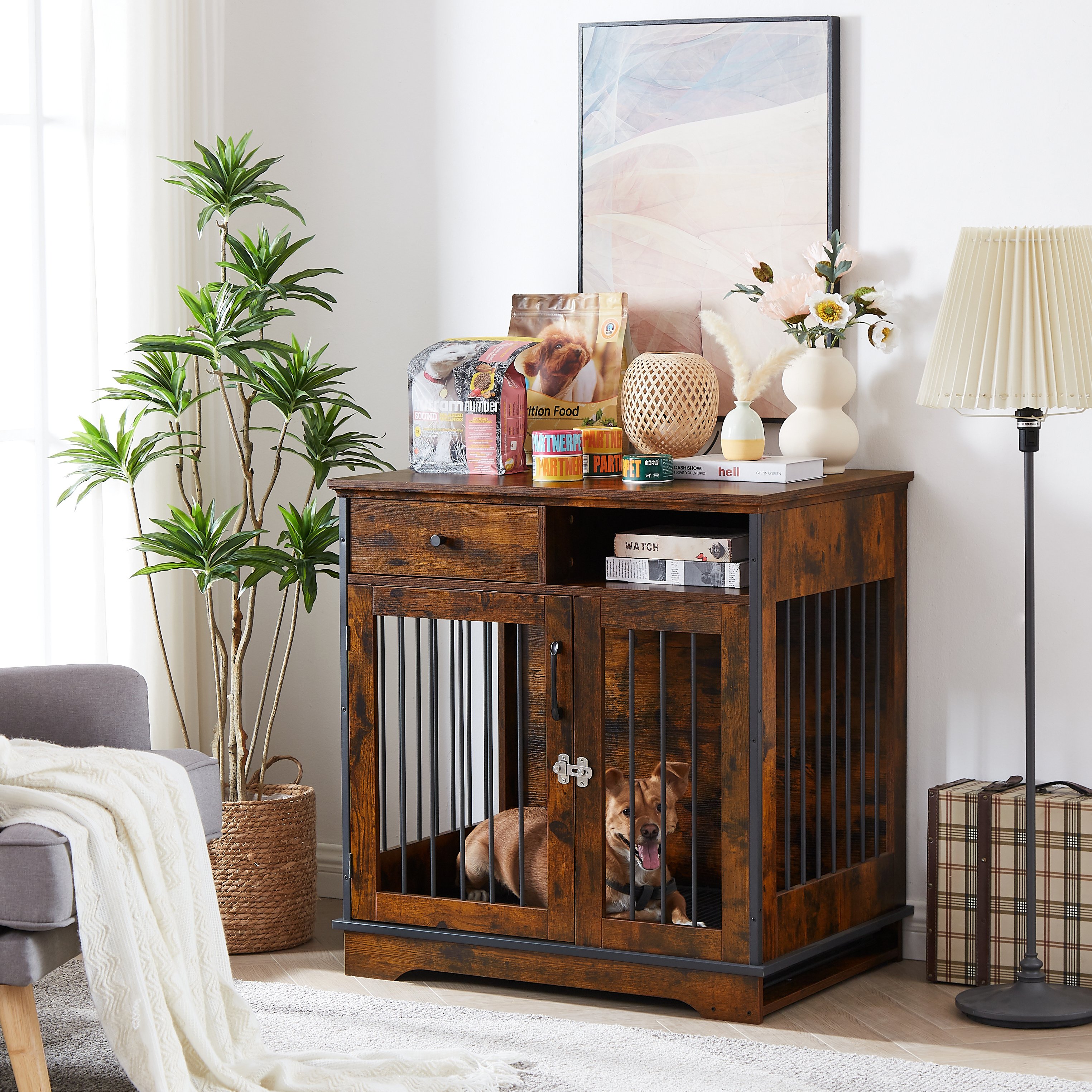 Dog crates; indoor pet crate end tables; decorative wooden kennels with removable trays.