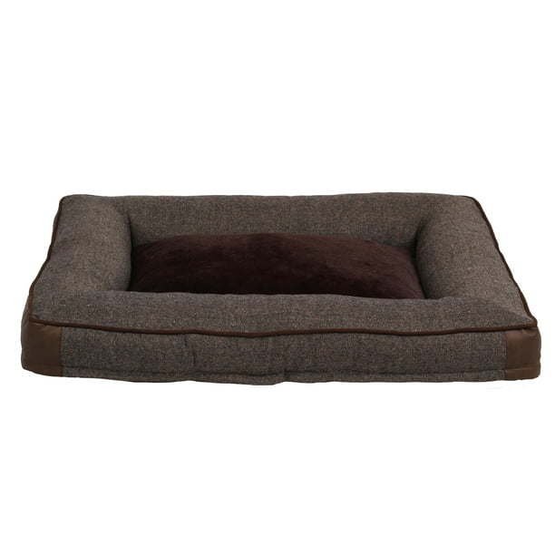 Designed for the fashionable and trendy dog, this Brown Rectangle Bolster Bed from offers comfort and softness for larger dogs that love to curl up. The bed features a shredded foam sleep center with a cushy fabric center, complemented by a sophisticated solid fabric with trim. Faux leather handles add a touch of luxury, making this bed fit for a king or queen. The soft poly-fiber filled bolsters around the edges provide a perfect headrest for better sleep. Whether it's a larger dog or a smaller dog that prefers more space, the Rectangle Bolster Bed will become their new favorite spot to hang out. The machine washable cover ensures easy care and maintenance.