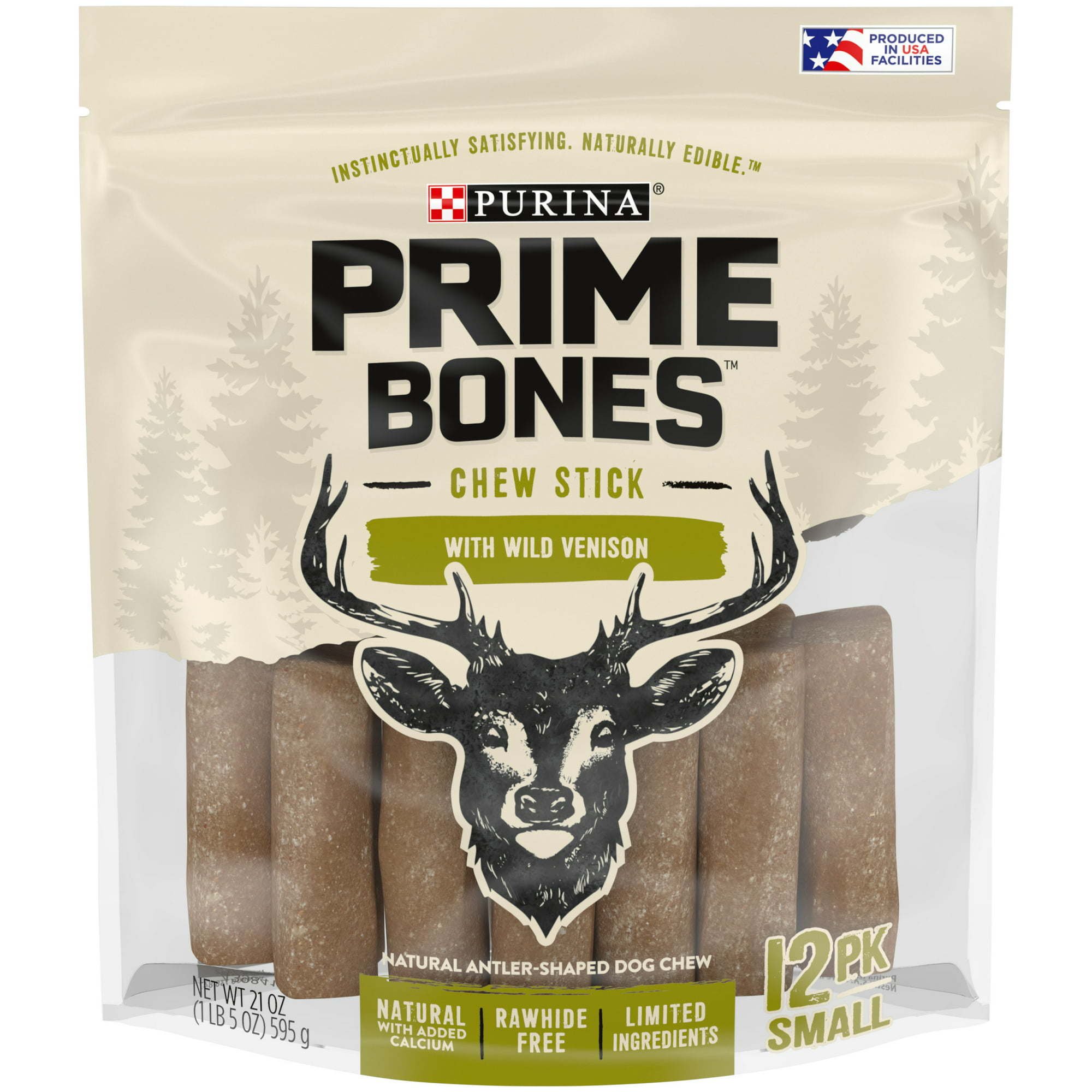 Purina Prime Bones Wild Venison Stick Treats for Dogs, Satisfy your dog's instinctual love of chewing with Purina Prime Bones Chew Stick With Wild Venison small dog bones. These extra-long-lasting, natural dog treats with added calcium are rawhide free and provide a safe and naturally edible treat that your small dog is sure to love. Each of these limited ingredient dog chew bones provides extra-long-lasting enjoyment with an antler-shaped chew to keep him entertained and thinking about his next big adventure in the wild. With big, untamed flavor, these dog treats for small dogs are just the right size for your small dog to chew, giving him rawhide free dog chews that help clean his teeth, too.
